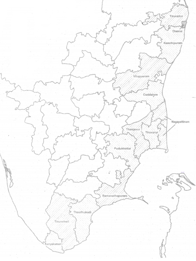 3. Tamil Nadu coast (among 13 coastal districts, Nagapattinam and Cuddalore districts are frequently affected).