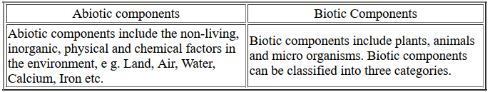 Abiotic components include the non-living, in-organic, physical and chemical factors in the environment, e.g., Land, Air, Water, Calcium, Iron, etc.