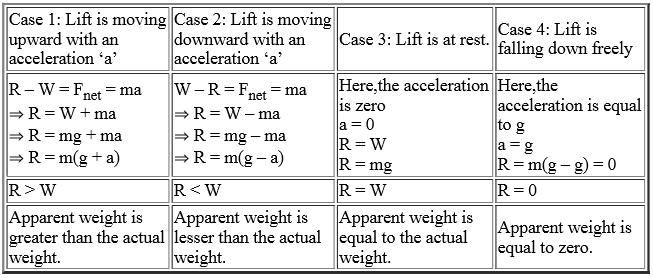 1. When the person in a lift moves down with an acceleration (a) equal to the acceleration due to gravity $(\mathrm{g})$, i.e., when $\mathrm{a}=\mathrm{g}$, this motion is called as 'free fall'.