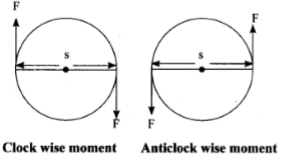 (iii) Moment of a couple $=$ Force $\times$ perpendicular distance between the line of action of forces $\mathrm{M}=\mathrm{F} \times \mathrm{S}$