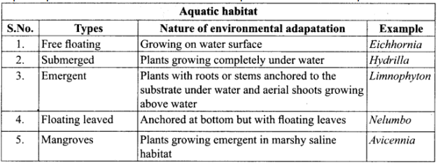 Make a list of aquatic plants and their environmental adaptation with an example.