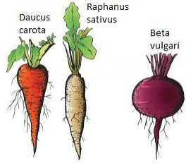 1. Conical Root - These are cone like, broad at the base and gradually tapering towards the apex. e.g. Daucus carota.