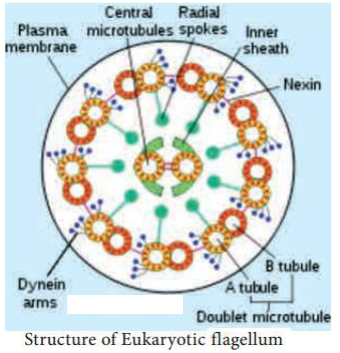 Structure: Eukaryotic Flagella are enclosed by unit membrane and it arises from a basal body. Flagella is composed of outer nine pairs of microtubules with two microtubules in its centre ( $9+2$ arrangement). Flagella are microtubule projection of the plasma membrane. Flagellum is longer than cilium (as long as $200 \mathrm{~m}$ ). The structure of flagellum has an axoneme made up microtubules and protein tubulin.