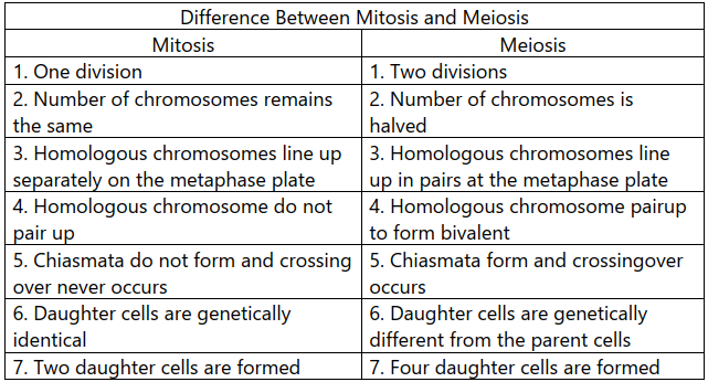 Differentiate between Mitosis and Meiosis.
