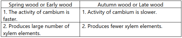 In winter, the cambium is less active and forms fewer xylary elements that have narrow vessels / tracheids and this wood is called autumn wood or late wood.