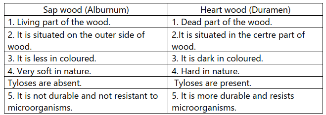 Sap wood and heart wood can be distinguished in the secondary xylem. In any tree the outer part of the wood, which is paler in colour, is called sap wood are alburnum. The centre part of the wood, which is darker in colour is called heart wood or duramen. The sap wood conducts water while the heart wood stops