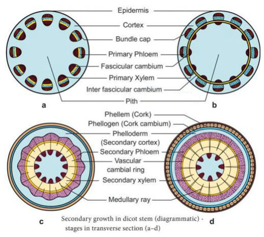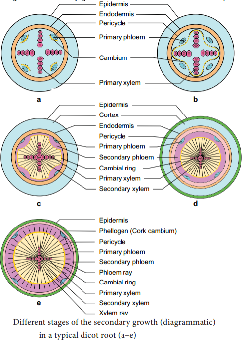 Draw the different stages of secondary growth in a dicot root and label the parts.