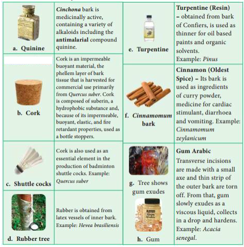 Bark protects the plant from parasitic fungi and insects, prevents water loss by evaporation and guards against variations of external temperature. It is an insect repellent, decay proof, fireproof and is used in obtaining drugs or spices. The phloem cells of the bark are involved in conduction of food while secondary cortical cells involved in storage.