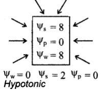 - Hypotonic (Hypo - low; tonic = solute): This is a weak solution (high sol vent / low or zero solute/ high $\Psi$ ) and it diffuses water out to other solutions.