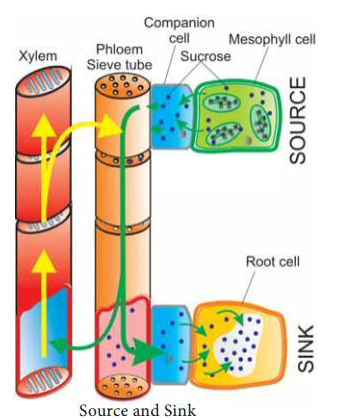 A similar analogous system as given in the experiment exists in plants: Chamber " $\mathrm{A}$ " is analogous to mesophyll cells of the leaves which contain a higher concentration of food material in soluble form. In short " $\mathrm{A}$ " is the production point called "source". Chamber " $\mathrm{B}$ " is analogous to cells of stem and roots where the food material is utilized. In short " $\mathrm{B}$ " is consumption end called "sink". Tube " $\mathrm{T}$ " is analogous to the sieve tube of phloem.