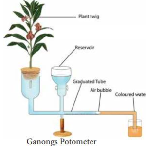 A twig or a small plant is fixed to the wider arm through a split cock. The other bent end of the horizontal tube is dipped into a beaker containing coloured water. An air bubble is introduced into the graduated tube at the narrow end. Keep this apparatus in bright sunlight and observe. As transpiration takes place, the air bubble will move towards the twig. The loss is compensated by water absorption through the xylem portion of the twig. Thus, the rate of water absorption is equal to the rate of transpiration.