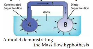 Mass flow theory was first proposed by Munch (1930) and elaborated by Crafts (1938). According to this hypothesis, organic substances or solutes move from the region of high osmotic pressure (from mesophyll) to the region of low osmotic pressure along the turgor pressure gradient. The principle involved in this hypothesis can be explained by a simple physical system as shown in figure.