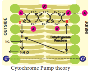 According to this theory, the enzyme dehydrogenase on inner surface is responsible for the formation of protons $\left(\mathrm{H}^{+}\right)$and electrons (e-). As electrons pass outward through electron transport chain there is a corresponding inward passage of anions.