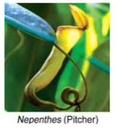 (i) Nepenthes (Pitcher plant): Pitcher is a modified leaf and contains digestive enzymes. Rim of the pitcher is provided with nectar glands and acts as an attractive lid. When insect is trapped, proteolytic enzymes will digest the insect.
