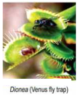 (iv) Dionaea (Venus fly trap): Leaf of this plant modified into a colourful trap. Two folds of lamina consist of sensitive trigger hairs and when insects touch the hairs it will close.