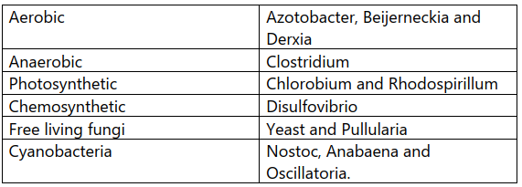 Symbiotic bacterium like Rhizobium fixes atmospheric nitrogen. Cyanobacteria found in Lichens, Anthoceros, Azolla and coralloid roots of Cycas also fix nitrogen. Non - symbiotic (free living bacteria) like Clostridium also fix nitrogen. Symbiotic nitrogen fixation: