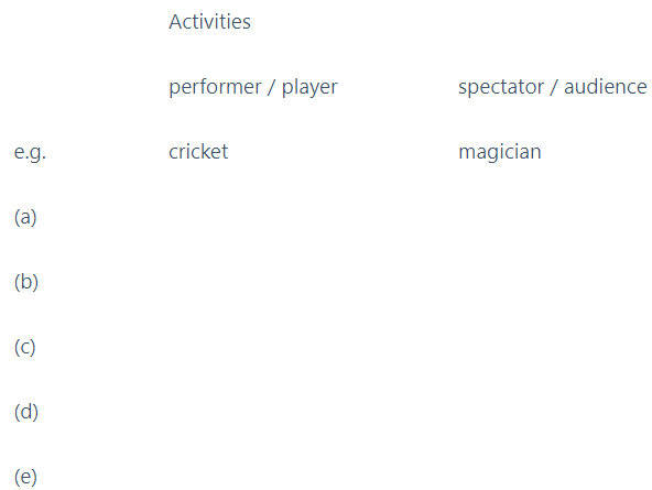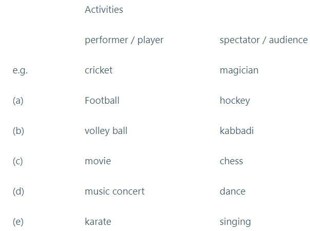 Not everybody loves to play and participate in games, sports and other extra-curricular activities. Some of us wish to be mere spectators. List out the activities in which you like to be either a performer or a spectator. Share your views with the class.