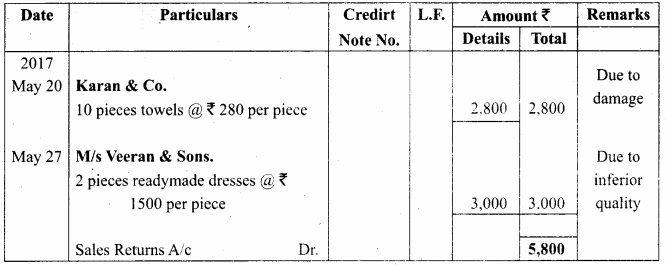 May 27 Returned 2 pieces of ready-made dresses by M/’s. Veeran&Sons due to inferior quality and cash not paid