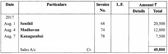- Aug. 1 – Sold goods to Senthil as per Invoice No. 68 for ₹ 20,500 on credit