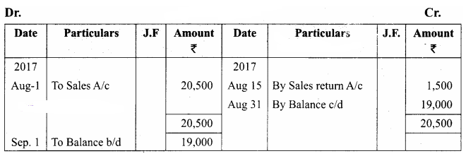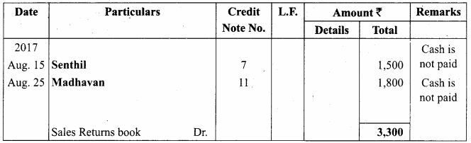 - Aug. 15 – Returns inward by Senthil as per Credit Note no. 7 for ₹ 1,500 for which cash is not paid