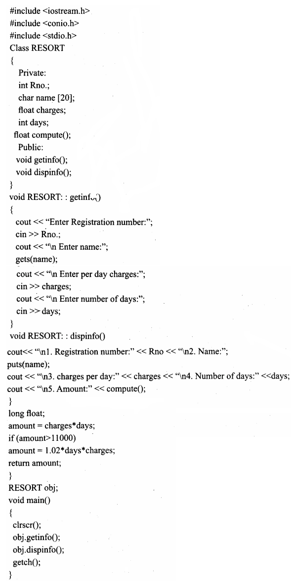 dispdata() member function to display code, quantity, price and tax. The tax is calculated as if the quantity is more than 150, tax is 3000, or else 1000.