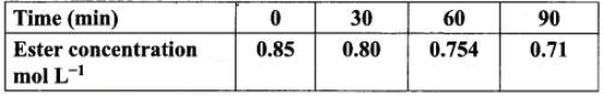 Hydrolysis of an ester in an aqueous solution was studied by titrating the liberated carboxylic acid against sodium hydroxide solution. The concentrations of the ester at different time intervals are given below.