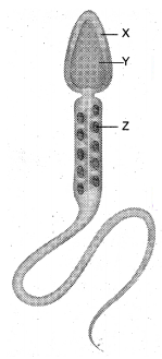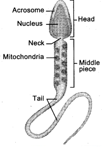 The human sperm is a microscopic, flagellated and motile gamete. The whole body of the sperm is enveloped by P plasma membrane and is composed of a head, neck and tail. The head comprises of two parts namely the acrosome and nucleus. Acrosome is a small cap like pointed structure present at the tip of the nucleus and is formed mainly from the Golgi body of the spermatid. It contains hyaluronidase, a proteolytic enzyme, popularly known as sperm lysin which I helps to penetrate the ovum during fertilization. The nucleus is flat and oval. The neck is very short and is present between the head and the middle piece.
