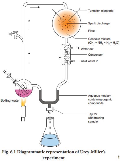 Urey and Miller (1953), paved way for understanding the possible synthesis of organic compounds that led to the appearance of living organisms is depicted in the Figure In their experiment, a mixture of gases was allowed to circulate over electric discharge from a tungsten electrode. A small flask was kept boiling and the steam emanating from it was made to mix with the mixture of gases (ammonia, methane, and hydrogen) in the large chamber that was connected condensed to form water which ran down the ‘U’ tube.