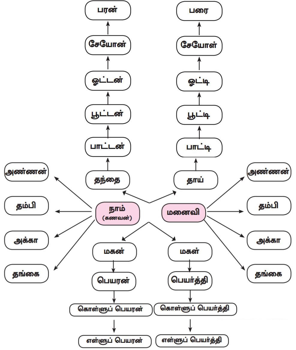 குடும்ப உறுப்பினர்களின் உறவுமுறைப் பெயர்களை அட்டவணைப்படுத்தி எழுதுக.
