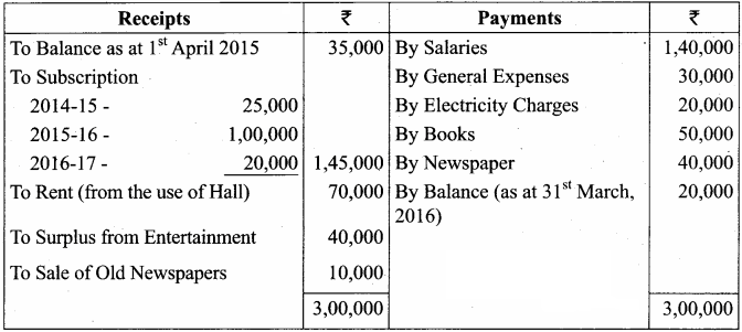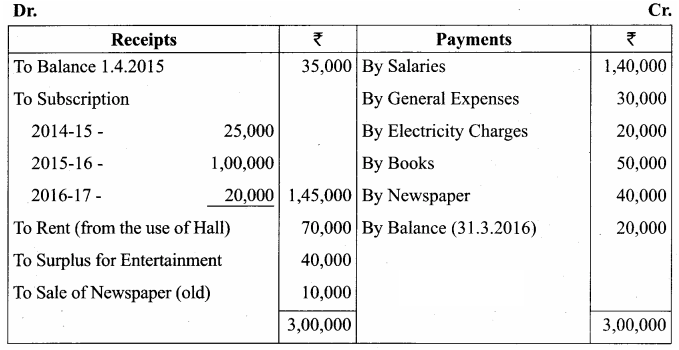 1. The Club has 50 members each paying an annual subscription of 2,500. Subscriptions outstanding on 31st March, 2015 were to the extent of 30,000.