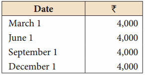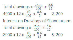 Sundar and Shanmugam are two partners equally. Sundar drew regularly Rs. 4,000 end of every month. Shanmugam draws Rs. 8,000 regularly beginning of every month. Calculate interest on their drawings @10%.