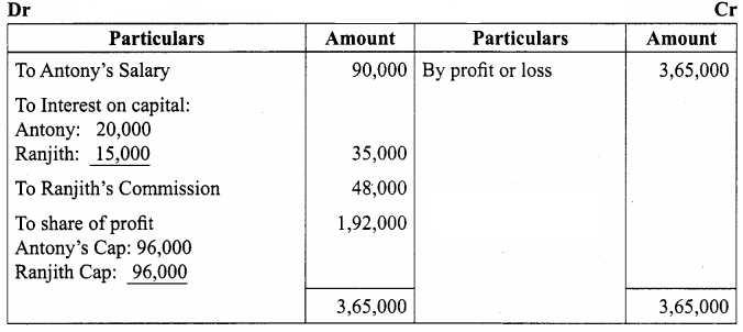 Antony and Ranjith started a business on 1st April 2018 with capitals of 4,00,000 and 3,00,000 respectively. According to the Partnership Deed, Antony is to get salary of 90,000 per annum, Ranjith is to get 25% commission on profit after allowing salary to Antony and interest on capital @ 5% p.a. but before charging such commission. Profit – sharing ratio between the two partners is 1:1. During the year, the firm earned a profit of 3,65,000.