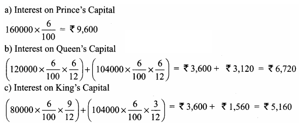 Prince, Queen and Kings had capital of Rs. 1,60,000, Rs. 1,20,000 and Rs. 80,000 respectively, on 1.4.2010. Queen withdraw Rs. 16,000 on 30.9.2010. King introduced additional capital Rs. 24,000 on 31.12.10. Calculate interest on capital @ 6% p.a. on 31.3.2011.