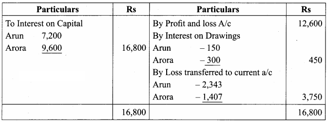 Arun and Arora were partners sharing profits and losses in the ratio 5:3. Their fixed capitals on 1.4.2016 were Arun Rs. 60,000; Arora Rs. 80,000. Interest on capital @ Rs. 12%. Interest on drawings @15% p.a. Profit for the year ended 31.3.2017 before all above adjustment was Rs. 12,600. Drawings: Arun Rs. 2,000. Arora Rs. 4,000 during the year. Prepare profit and loss appropriation account.