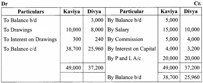 Write up the capital accounts and current accounts of the partners Kaviya and Divya from the following: