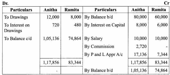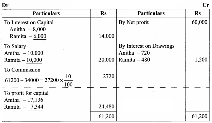 The profit for the year Rs. 60,000. Drawings were Anitha Rs. 12,000 and Ramita Rs. 8,000. Show profit and loss appropriation account and the capital A/c.