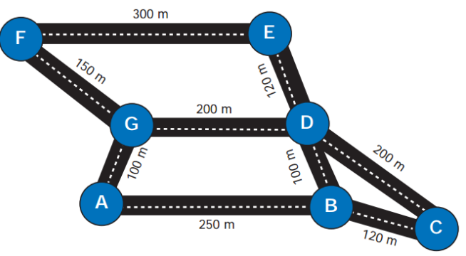 (a) Route $1: \mathrm{B} \rightarrow \mathrm{A} \rightarrow \mathrm{G} \rightarrow \mathrm{F}$