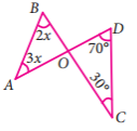 Two line segments $\overline{A D}$ and $\overline{B C}$ intersect at $\mathrm{O}$. Joining $\overline{A B}$ and $\overline{D C}$ we get two triangles, $\Delta \mathrm{AOB}$ and $\triangle D O C$ as shown in the figure. Find the $\angle A$ and $\angle B$.