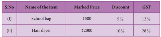 Formula: Bill amount $=$ Discounted price $\times\left(\frac{(100+\mathrm{GST} \%)}{100}\right)$