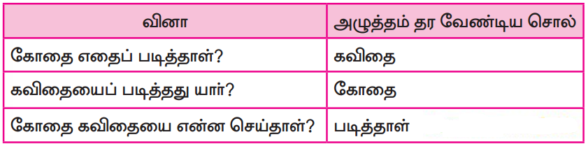 கொடுக்கப்பட்டுள்ள வினாக்களுக்கு ஏற்பத் தொடரில் அழுத்தம் தர வேண்டிய சொற்களை எடுத்து எழுதுக.