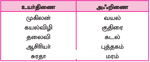 கீழ்க்காணும் சொற்களை உயர்திணை, அஃறிணை என வகைப்படுத்துக.