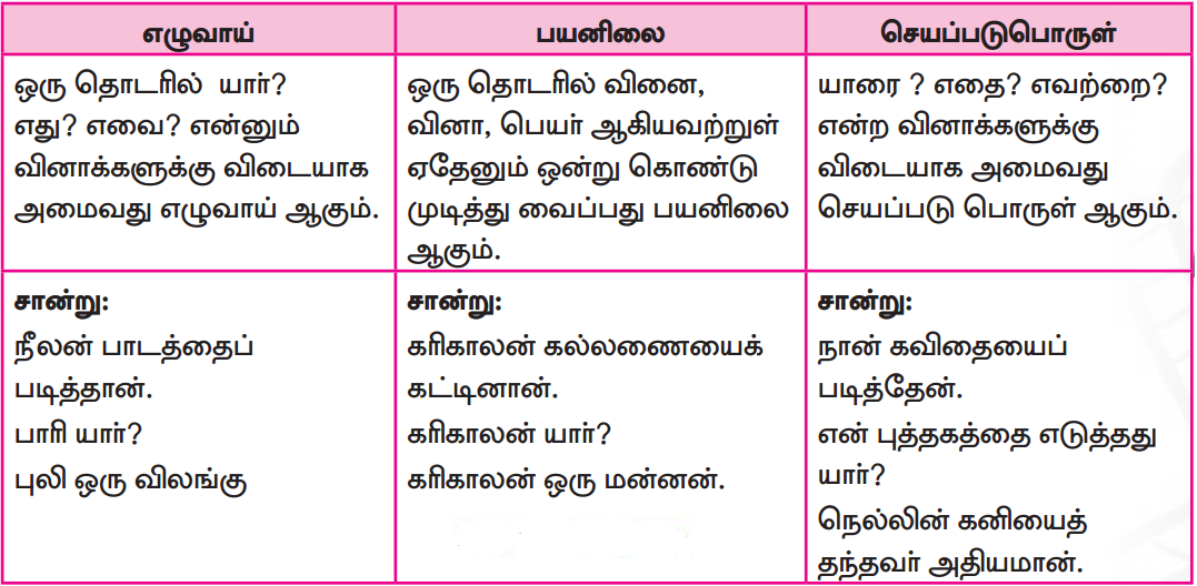 பின்வரும் தொடர்களை எழுவாய், பயனிலை, செயப்படுபொருள் எனப் பிரிக்க.