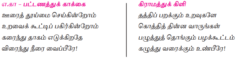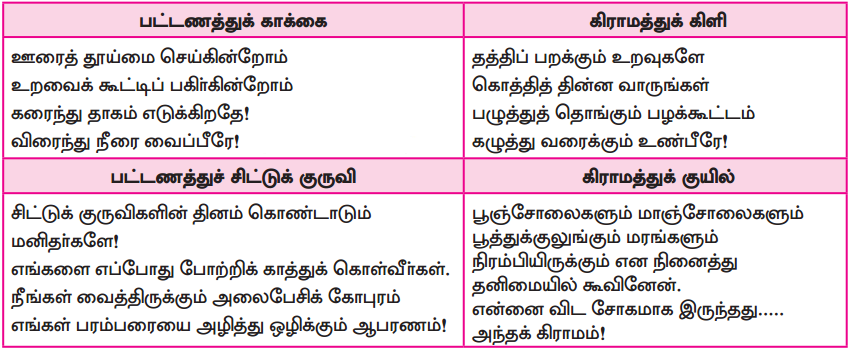 பட்டணத்துப் பறவைகளும் ஊர்ப் பறவைகளும் என்ற தலைப்பில் பறவைகள் கூறுவன போலச் சிறு சிறு கவிதைகள் படைக்க.