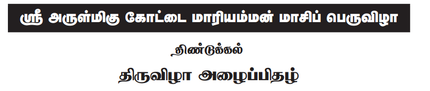 இந்தாண்டு ஸ்ரீஹேவிளம்பி வருடம் மாசி மாதம் 11ஆம் நாள் திண்டுக்கல் அருள்மிகு ஸ்ரீ கோட்டை மாரியம்மன் மாசிப் பெருவிழா நடைபெறும். அப்பொழுது கீழ்க்குறித்த நாள்களில் பல்வேறு நிகழ்ச்சிகள் நடைபெறும். பக்தகோடிகள் கலந்து கொண்டு சிறப்பிக்குமாறு அன்புடன் கேட்டுக்கொள்கிறோம்.