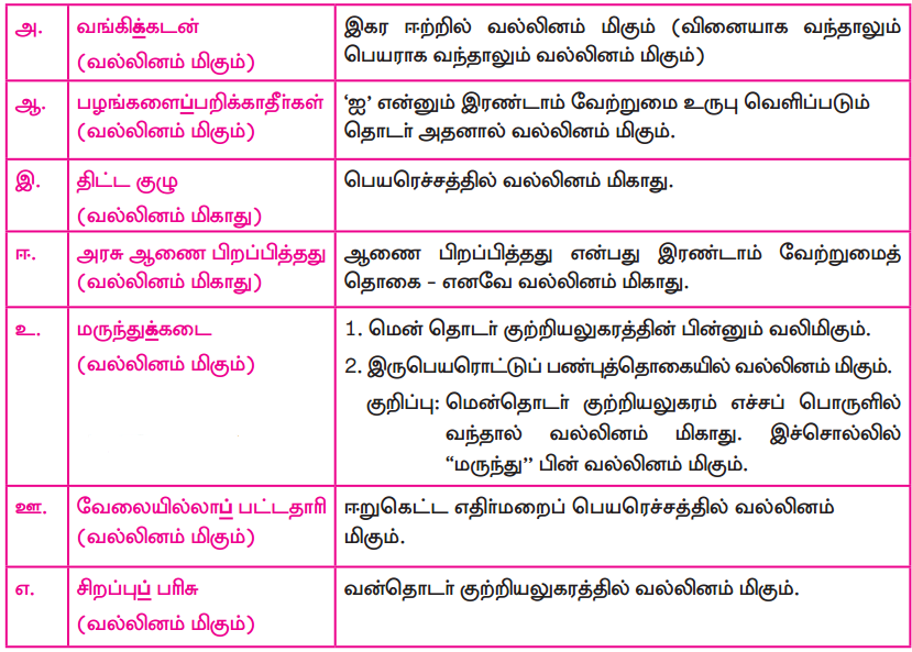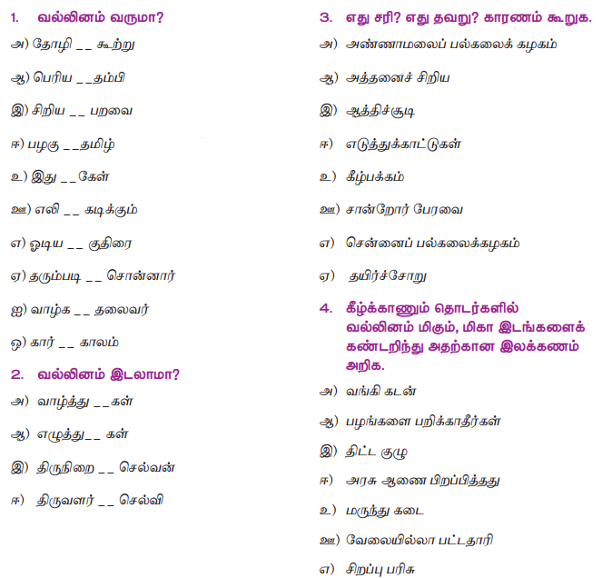 4. கீழ்க்காணும் தொடர்களில் வல்லினம் மிகும் , மிகா இடங்களைக் கண்டறிந்து அதற்கான இலக்கணம் அறிக.