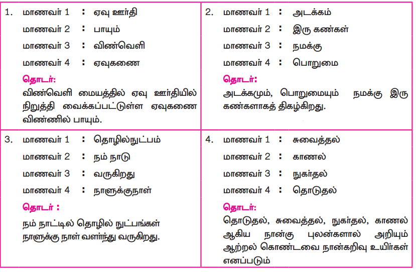 - இப்படியே நான்கு மாணவர்களும் கூறிய சொற்களைக் கொண்டு ஒரு தொடர் அமைக்க.