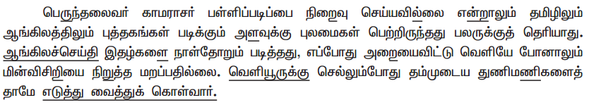 பெருந்தலைவர் காமராசர் பள்ளிப்படிப்பை நிரைவு செய்யவிள்ளை எண்ராலும் தமிழிலும் ஆங்கிலத்திலும் புத்தகங்கள் படிக்கும் அலவுக்கு புலமைகள் பெற்றிருந்தது பலருக்குத் தெரியாது. ஆங்கிலச் செய்தி இதழ்கலை நாள்தோறும் படித்தது. எப்போது அரையை விட்டு வெளியே போனாலும் மின்விசிரியை நிருத்த மறப்பதில்லை. வெளியூருக்குச் செல்லும்போது தம்முடைய துணிமனிகளைத் தாமே எடுத்துவைத்துக்கொள்வார்.
