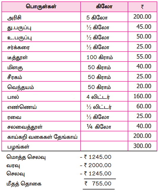 ஒரு வாரத்திற்குத் தேவையான உணவுப் பொருள்களின் வரவு செலவு பட்டியலை உருவாக்குக.