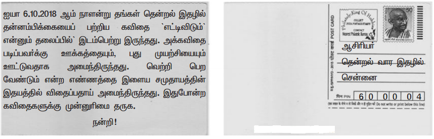 வார இதழ் ஒன்றில் படித்த கவிதையைப் பாராட்டி அந்த ஆசிரியருக்கு அஞ்சல் அட்டையில் கடிதம்