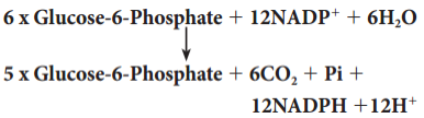 It is also known as Hexose monophosphate shunt (HMP Shunt) or Direct Oxidative Pathway. It consists of two phases, oxidative phase and non oxidative phase. The oxidative events convert six molecules of six carbon Glucose - 6 - phosphate to 6 molecules of five carbon sugar Ribulose - 5 phosphate with loss of $6 \mathrm{CO}_2$ molecules and generation of $12 \mathrm{NADPH}+\mathrm{H}^{+}$(not NADH). The remaining reactions known as non - oxidative pathway, convert Ribulose - 5 - phosphate molecules to various intermediates such as Ribose 5 - phosphate(5C), Xylulose - 5 - phosphate(5C), Glyceraldehyde - 3 phosphate(3C), Sedoheptulose - 7 - Phosphate (7C), and Erythrose - 4 phosphate (4C). Finally, five molecules of glucose -6 - phosphate is regenerated. The overall reaction is: